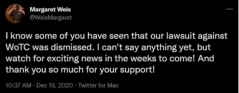 The lawsuit would eventually be settled out of court later that year, with Weis herself eventually informing fans, “I know some of you have that that our lawsuit against WoTC was dismissed. I can’t say anything yet, but watch for exciting news in the weeks to come! And thank you so much for your support!”