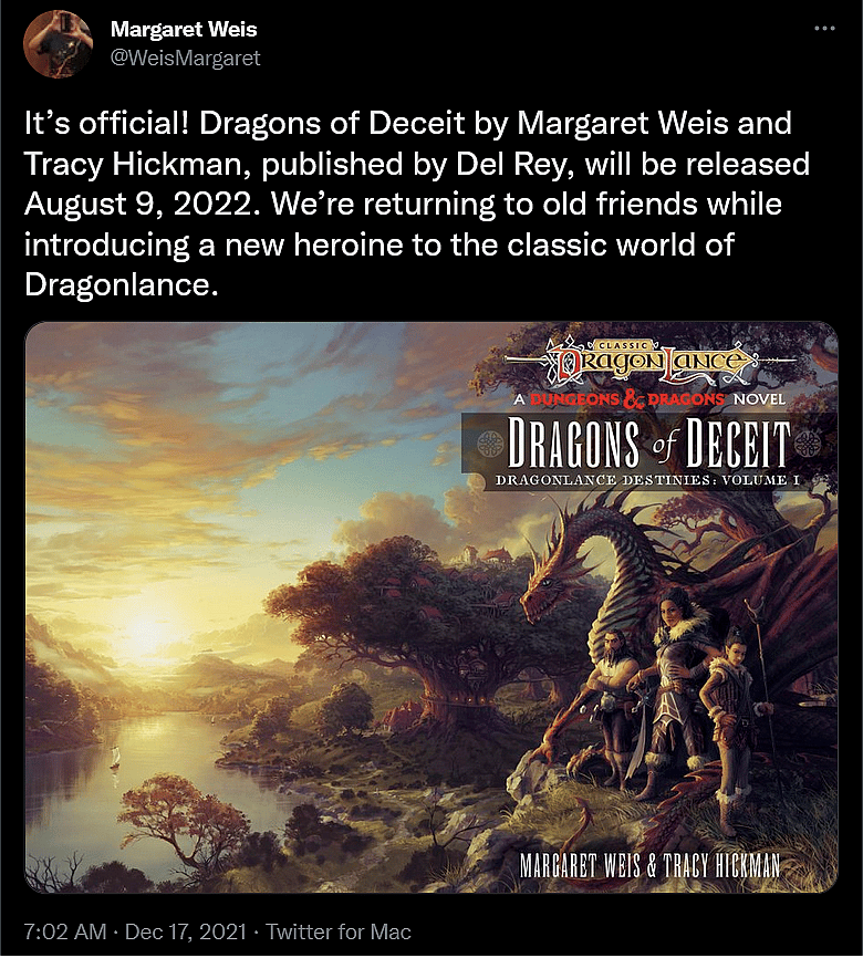 “It’s official!” exclaimed Weis on December 17th, 2021. “Dragons of Deceit by Margaret Weis and Tracy Hickman, published by Del Rey, will be released August 9, 2022. We’re returning to old friends while introducing a new heroine to the classic world of Dragonlance.”