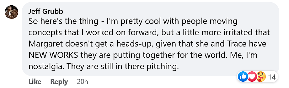 Weis’ news would eventually drew a response from Grubb, who returned to the conversation the next day to opine, “So here’s the thing – I’m pretty cool with people moving concepts that I worked on forward, but a little more irritated that Margaret doesn’t get a heads-up, given that she and Trace have NEW WORKS they are putting together for the world. Me, I’m nostalgia. They are still in there pitching.”
