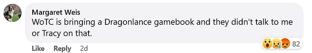 Replying to Grubb, Weis then similarly revealed that Wizards of the Coast “is bringing a Dragonlance gamebook and they didn’t talk to me or Tracy on that.”