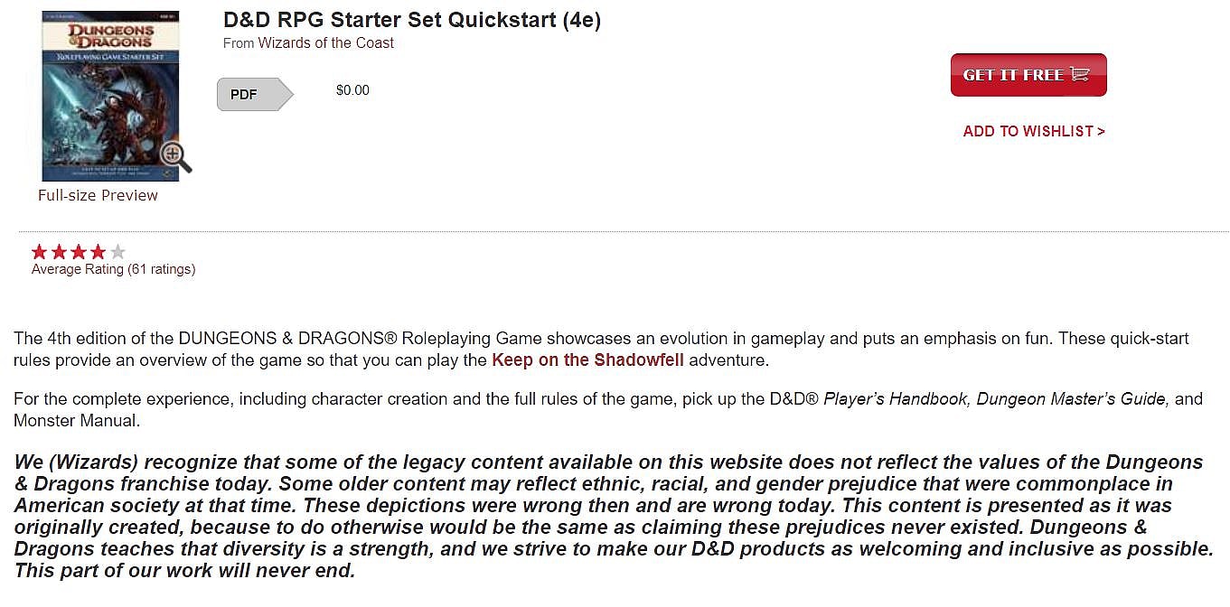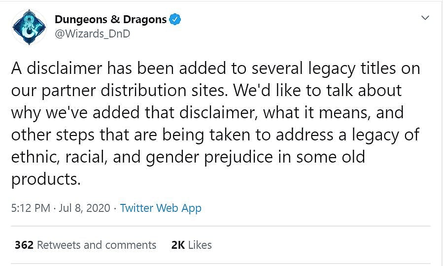 It reads, “We (Wizards) recognize that some of the legacy content available on this website does not reflect the values of the Dungeons & Dragons franchise today. Some older content may reflect ethnic, racial, and gender prejudice that were commonplace in American society at that time.”