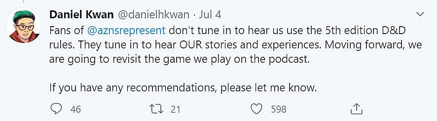 He wrote, “Fans of Asians Represent Podcast don’t tune in to hear us use the 5th edition D&D rules. They tune in to hear OUR stories and experiences.”