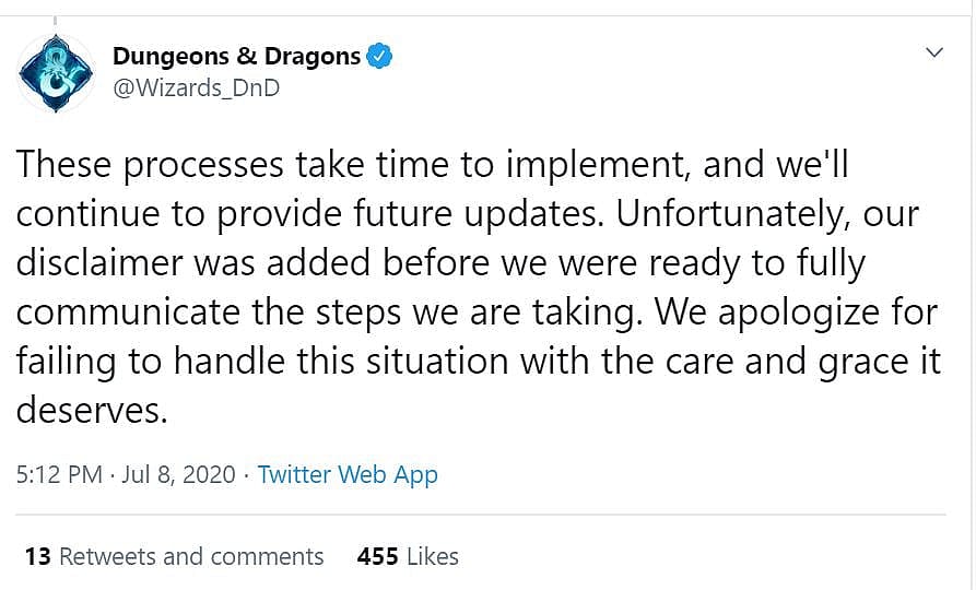 Dungeons and Dragons then apologized, “Simply put, we messed up and we’re sorry. Wizards of the Coast is constantly working to be better, and we have a lot of work to do, especially so in repairing trust with our community.”