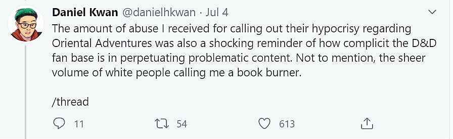 He wrote, “The amount of abuse I received for calling out their hypocrisy regarding Oriental Adventures was also a shocking reminder of how complicit the D&D fan base is in perpetuating problematic content.”