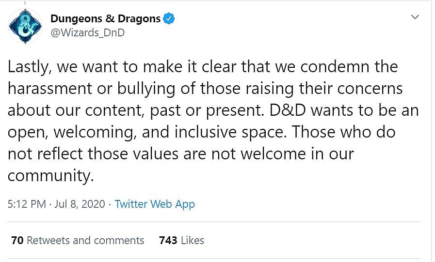 “D&D wants to be an open, welcoming, and inclusive space. Those who do not reflect those values are not welcome in our community,” the tweet concluded.
