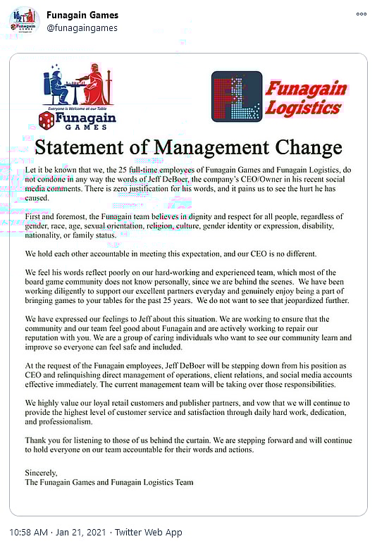 Just two days after this first post, on January 21st, Funagain Games officially announced that DeBoer would be stepping down from his position as CEO, stating that “there is zero justification for his words, and it pains us to see the hurt he has caused.”