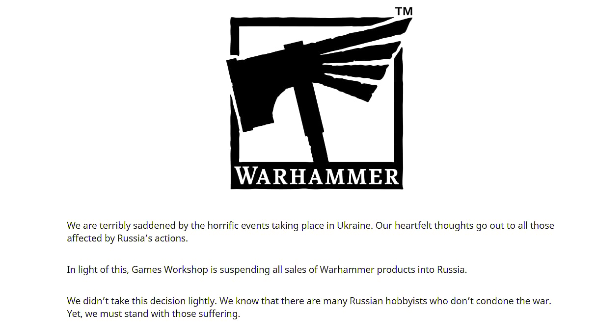 They continued, “In light of this, Games Workshop is suspending all sales of Warhammer products into Russia.”