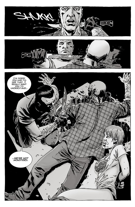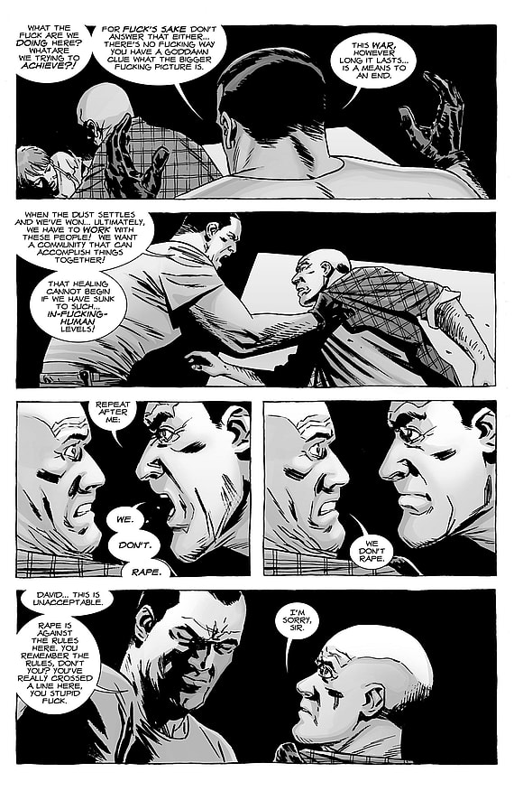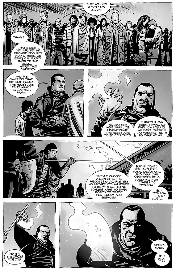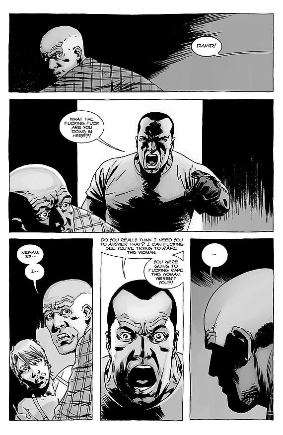 Others argue that Negan’s offer to his ‘brides’, which forces them to choose between becoming his willing concubine or living in squalor and suffering outside of his protection, can be seen as an act of rape via sexual coercion.