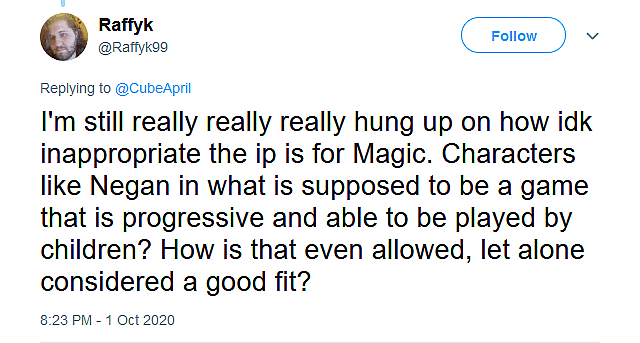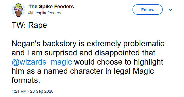 The official Twitter account for The Spike Feeders, a YouTube account dedicated to Magic: The Gathering’s commander format found “Negan’s backstory” to be “extremely problematic” and stated that they were “surprised and disappointed that @wizards_magic would choose to highlight him as a named character in legal Magic formats”.