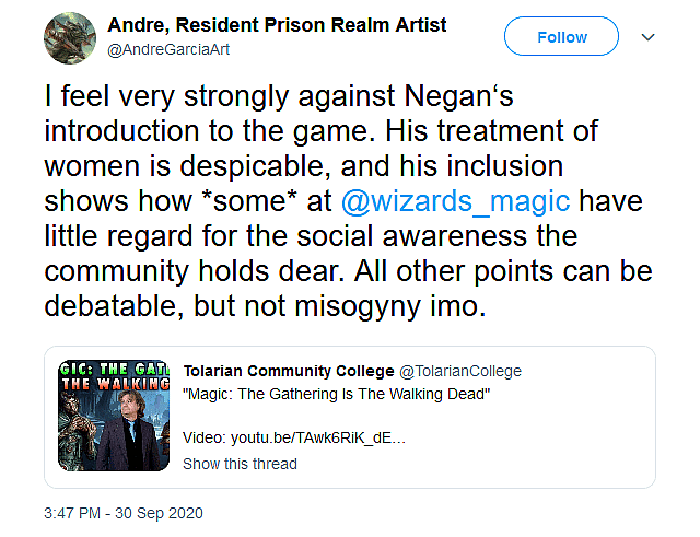 “I feel very strongly against Negan‘s introduction to the game,” said artist Andre Garcia. “His treatment of women is despicable, and his inclusion shows how *some* at @wizards_magic have little regard for the social awareness the community holds dear.”