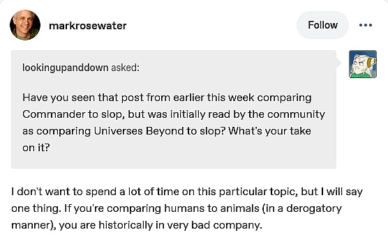 With White’s post adding fuel to both the Commander and Universes Beyond discourse, one curious player took to Rosewater’s Tumblr page and asked him for his “take” on the entire situation.