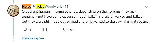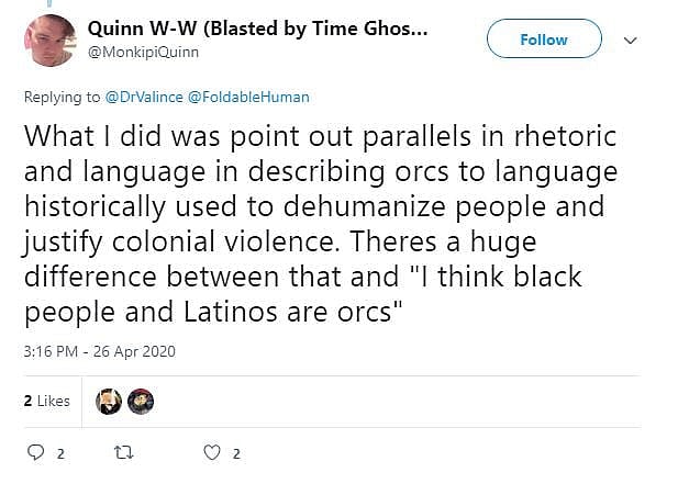 After initially asking their critics to “please learn how to read texts. Just basic media analysis stuff,” Welsh-Wilson would later explain that their statement was “about language used by colonizers to justify colonial violence,”stating that they were attempting to “point out parallels in rhetoric and language in describing orcs to language historically used to dehumanize people and justify colonial violence.”