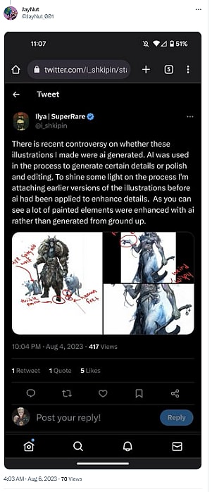 The artist who created these pieces of art, Ilya Shkipin, reacted to NevernotDM’s post in a now-deleted post writing, “There is recent controversy on whether these illustrations I made were ai generated. AI was used in the process to generate certain details or polish and editing. To shine some light on the process I’m attaching earlier versions of the illustrations before ai had been applied to enhance details. As you can see a lot of painted elements were enhanced with ai rather generated from ground up.”