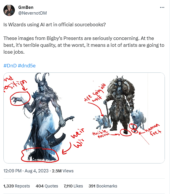 Twitter user NevernotDM questioned whether AI was used to generate art work for the Frost Giant Ice Shaper and Frostmourn that Dungeons & Dragons Beyond featured in a blog post previewing the book.