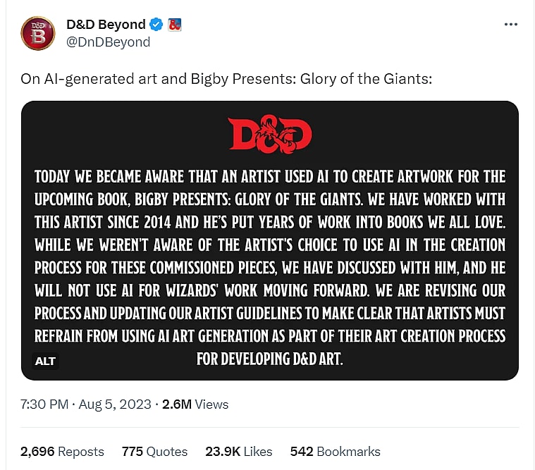 The statement began, “Today we became aware that an artist used AI to create artwork for the upcoming book, Bigby Presents: Glory of the Giants. We have worked with this artist since 2014 and he’s put years of work into books we all love. While we weren’t aware of the artist’s choice to use AI in the creation process for these commissioned pieces, we have discussed with him, and he will not use AI for Wizards’ work moving forward.”