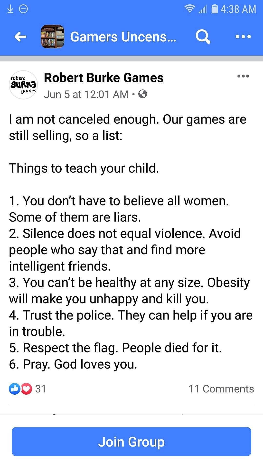 In the tweet he included a screen shot from Robert Burke Games’ Facebook page that included a list of things to teach your child.