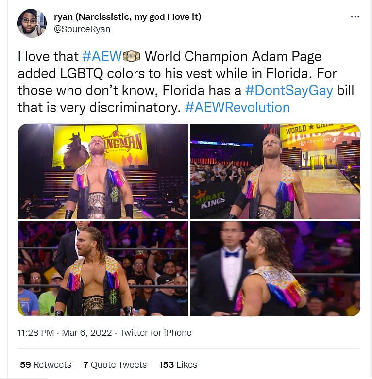 AEW is no stranger to politically grandstanding for progressive causes on their TV shows. Current AEW world champion Adam Page earlier this year protested the state of Florida’s Parental Rights in Education bill which banned the teaching of sexuality and transgenderism to children between kindergarten through third grade by wearing a rainbow-colored vest during a wrestling match in the city of Orlando, Florida.