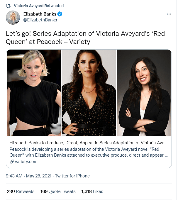 Banks confirmed the announcement on Twitter writing, “Let’s go! Series Adaptation of Victoria Aveyard’s ‘Red Queen’ at Peacock – Variety.”