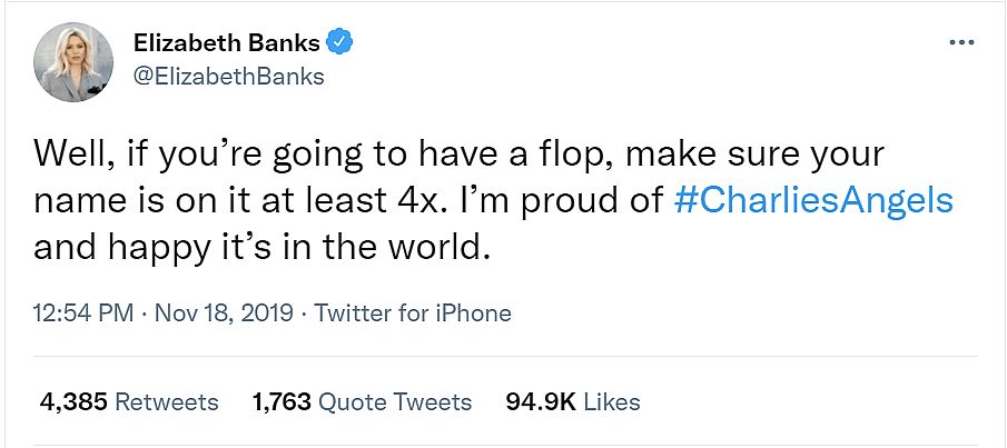 Despite this horrible performance at the box office, Banks declared she was proud of the film. She posted to Twitter, “Well, if you’re going to have a flop, make sure your name is on it at least 4x. I’m proud of Charlie’s Angels and happy it’s in the world.”
