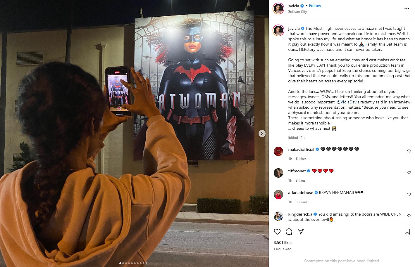 The show’s lead actress Javicia Leslie, who took over as Batwoman following Ruby Rose’s departure, shared a message to social media, “The Most High never ceases to amaze me! I was taught that words have power and we speak our life into existence. Well, I spoke this role into my life, and what an honor it has been to watch it play out exactly how it was meant to.”