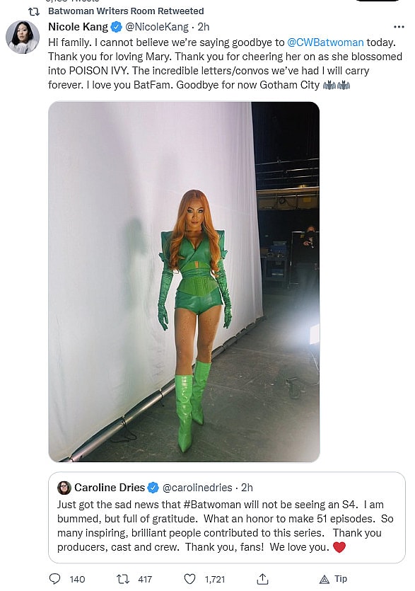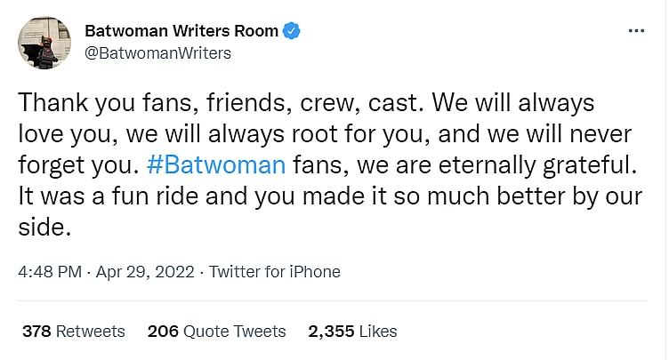 The Batwoman Writers wrote on Twitter, “Thank you fans, friends, crew, cast. We will always love you, we will always root for you, and we will never forget you.”