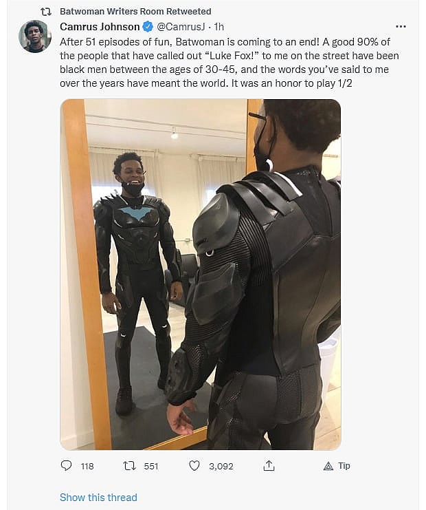 Camrus Johnson, who played Luke Fox, tweeted, “After 51 episodes of fun, Batwoman is coming to an end! A good 90% of the people that have called out “Luke Fox!” to me on the street have been black men between the ages of 30-45, and the words you’ve said to me over the years have meant the world.