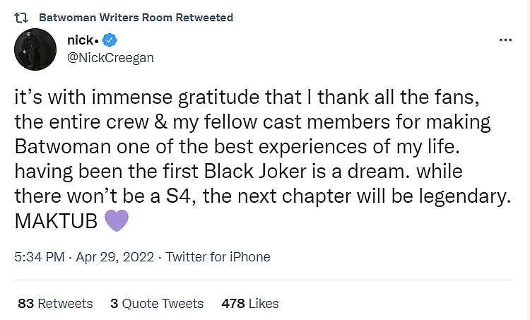 Nick Creegan, who played Marquis Jet and the show’s race-swapped Joker, wrote, “it’s with immense gratitude that I thank all the fans, the entire crew & my fellow cast members for making Batwoman one of the best experiences of my life. having been the first Black Joker is a dream. while there won’t be a S4, the next chapter will be legendary. MAKTUB.”