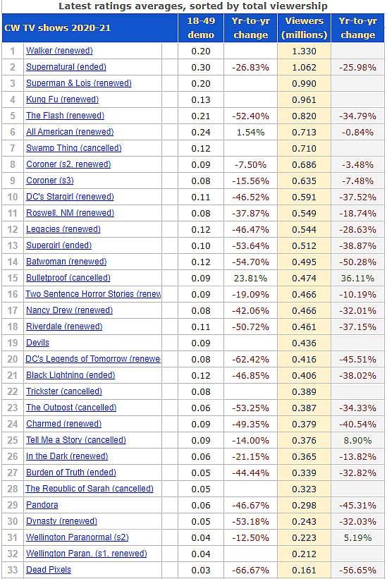 Walker isn’t the only series to sees its ratings nosedive. The Flash dropped by over 12% year over year. All American decline by 18%, Batwoman, whose ratings were already in the toilet still declined by nearly 10%.