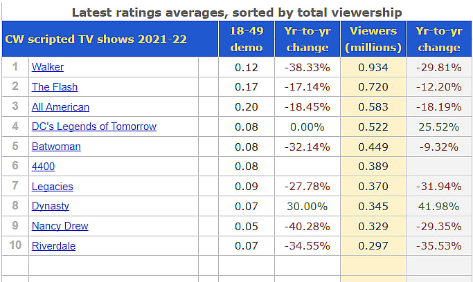 The only shows to see boosts in viewership in the current 2021 to 2022 season are DC’s Legends of Tomorrow, a 25% increase, and Dynasty a 30% increase. However, DC’s Legends of Tomorrow is still only averaging 522,000 viewers per episode and Dynasty is averaging only 345,000.