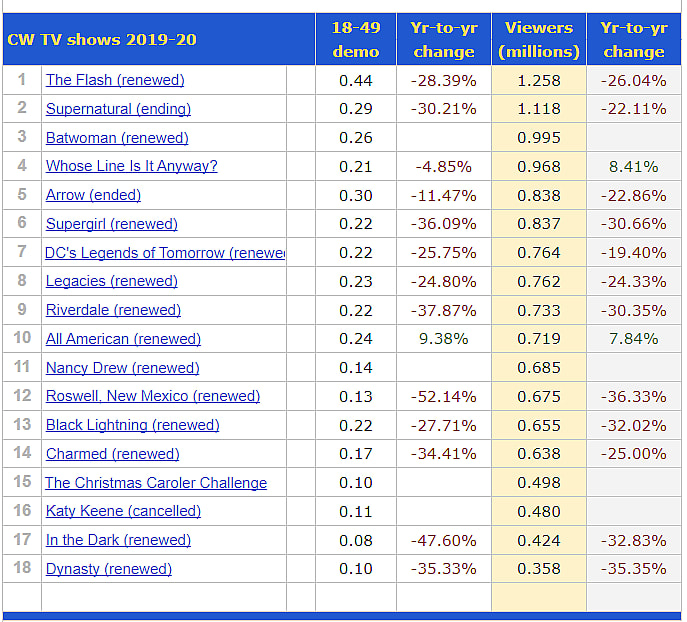 The constant decline was also seen during the 2019 to 2020 season. Only Whose Line Is It Anyway and All American saw their viewership increase.