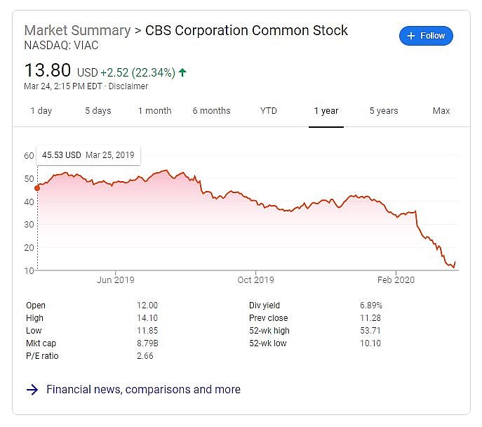 Not only has interest in the show declined, but CBS stock has also plummeted over the past year.