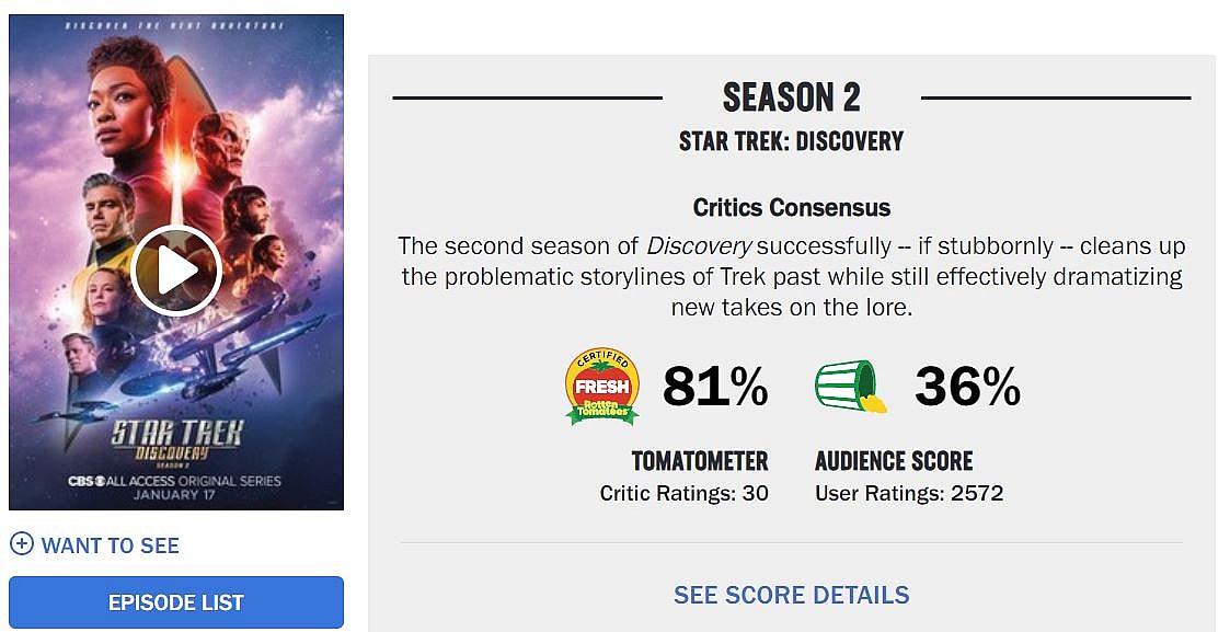 The second season would receive an even worse Audience Score than the first one on Rotten Tomatoes. It came in at 36% from 2,572 users. It had an average rating of 2.33 out of 5 stars.