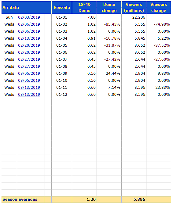 As you can see the show significantly declined from 20.404 million in its first episode to 7.976 million in its second episode. You might be thinking that’s a huge drop and as TV Series Finale points out it lost over 60% of its viewers.
