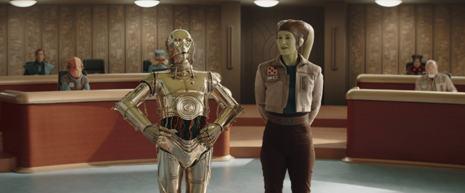 The episode opens with General Hera Syndulla standing in some kind of committee hearing where she gets lectured again by Senator Xiono about attempting to stop escaped prisoner Morgan Elsbeth from locating Grand Admiral Thrawn and returning with him to wreak havoc on the New Republic.