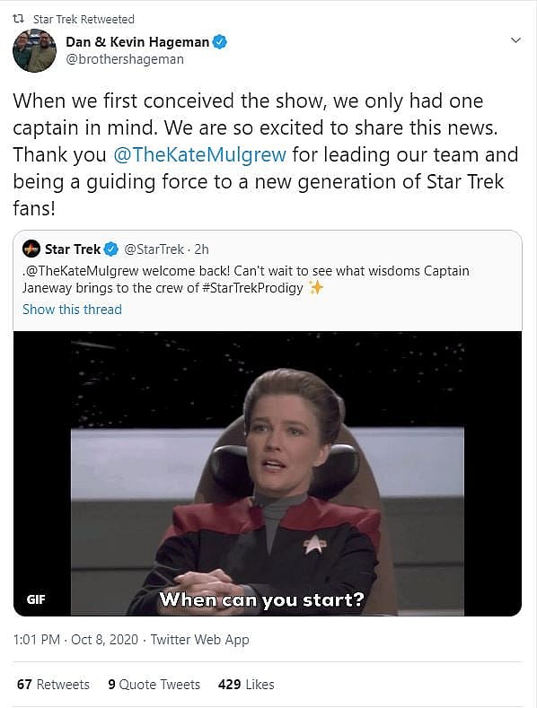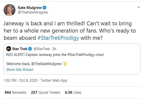 Mulgrew would also add on Twitter that she’s thrilled and that she “can’t wait to bring her to a whole new generation of fans.”