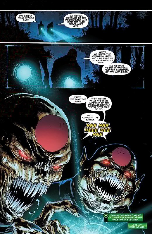 Jarta, talking to a superior officer, tries to insert herself into a mission to track down the Dominators, a race of aliens who killed “several Lanterns”, out of a sense of guilt for her absence during the slaughter.