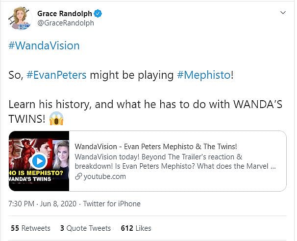 Randolph tweeted in June, “So, Evan Peters might be playing Mephisto!”