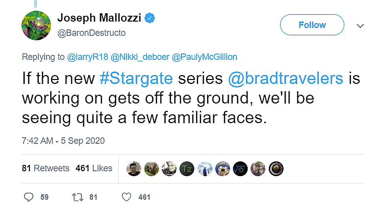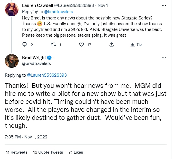 He wrote on Twitter, “If the new Stargate series Brad Wright is working on gets off the ground, we’ll be seeing quite a few familiar faces.”