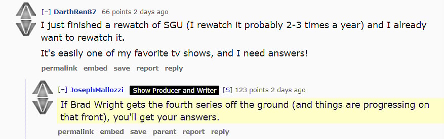 However, it appears the new series from Brad Wright has been completely shelved. In November, Wright gave an update on where he was with the new series.