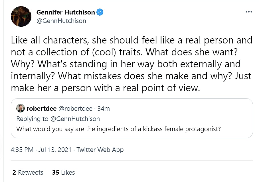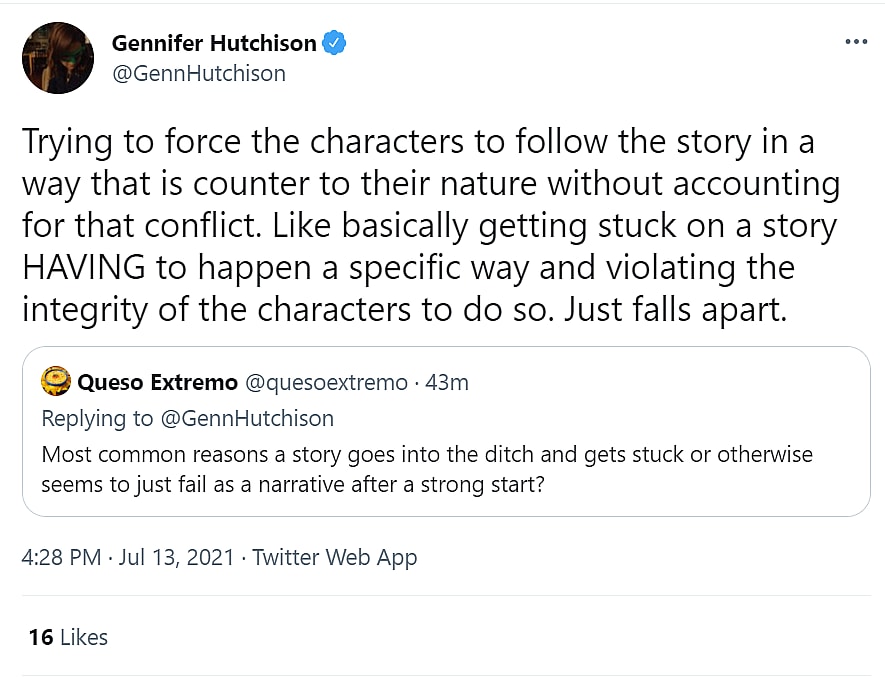 Hutchison tweeted, “So generally a good rule of thumb for me is that you set the big world stakes thing early, then you build on why they matter personally for your character and how that changes over time in the story.”