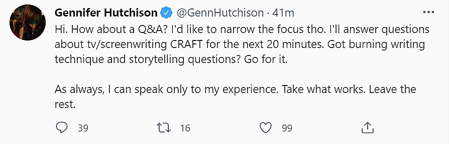 Hutchinson first announced the Q&A on Twitter writing, “Hi. How about a Q&A? I’d like to narrow the focus tho. I’ll answer questions about tv/sreenwriting CRAFT for the next 20 minutes. Got burning writing technique and storytelling questions? Go for it.”