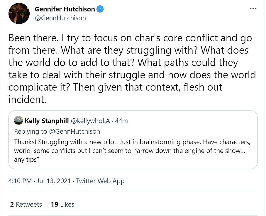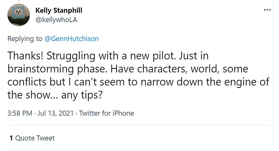 Another Twitter user, KellywhoLA, asked, “Struggling with a new pilot. Just in brainstorming phase. Have characters, world, some conflicts but I can’t seem to narrow down the engine of the show… any tips?”