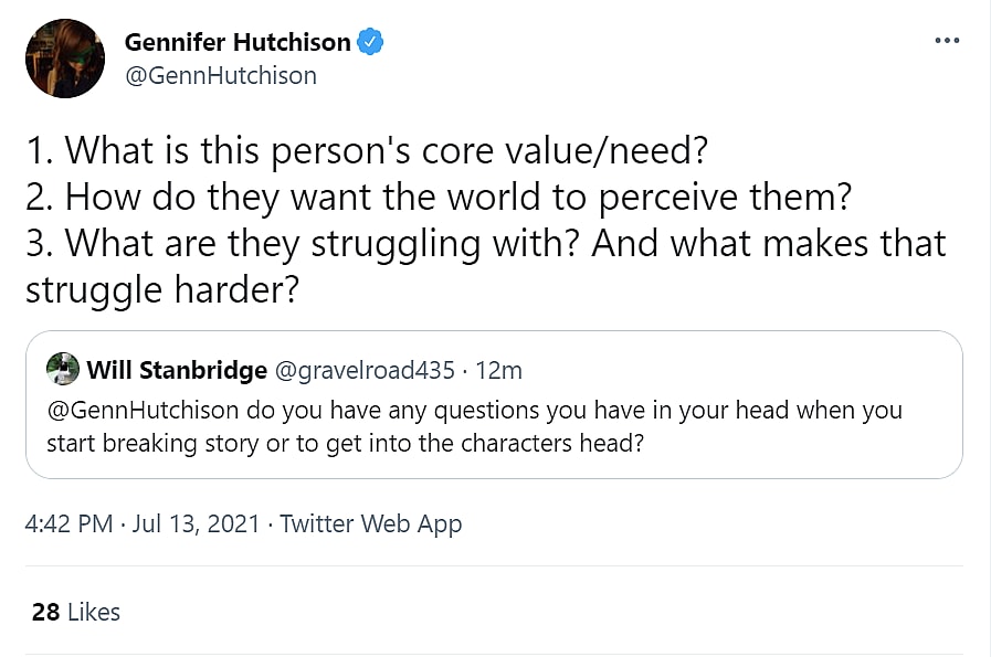 Hutchison laid out four questions. She tweeted, “What is this person’s core value/need? How do they want the world to perceive them? What are they struggling with? And what makes that struggle harder?