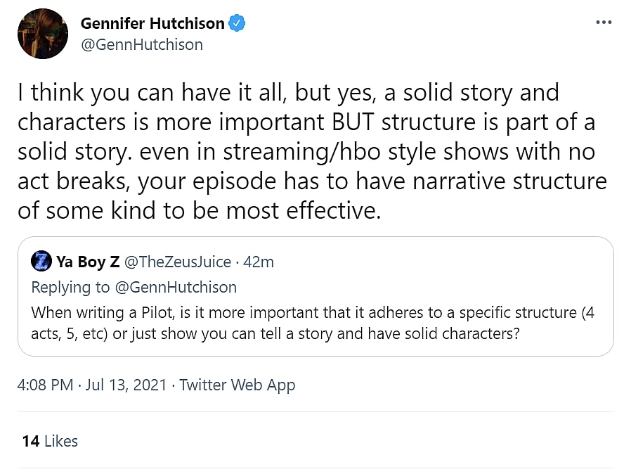 Hutchison responded, “I think you can have it all, but yes, a solid story and characters is more important BUT structure is part of a solid story. even in streaming/hbo style shows with no act breaks, your episode has to have narrative structure of some kind to be most effective.”