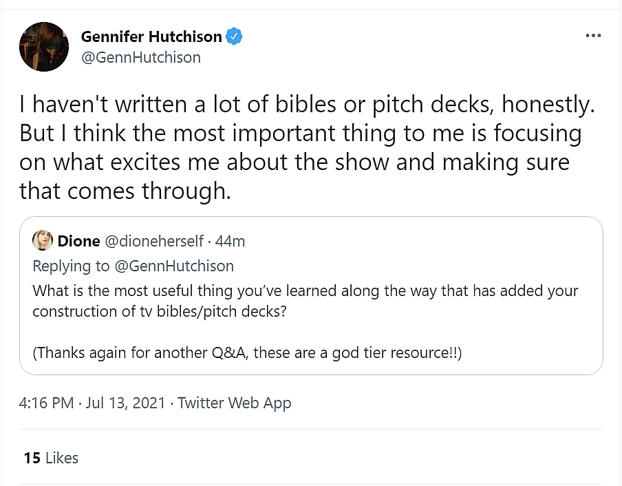 Twitter user Dionherself asked, “What is the most useful thing you’ve learned along the way that has added your construction of tv bibles/pitch decks?”