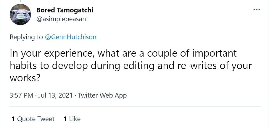 Twitter user Asimplepeasant also asked, “In your experience, what are a couple of important habits to develop during editing and re-writes of your works?”