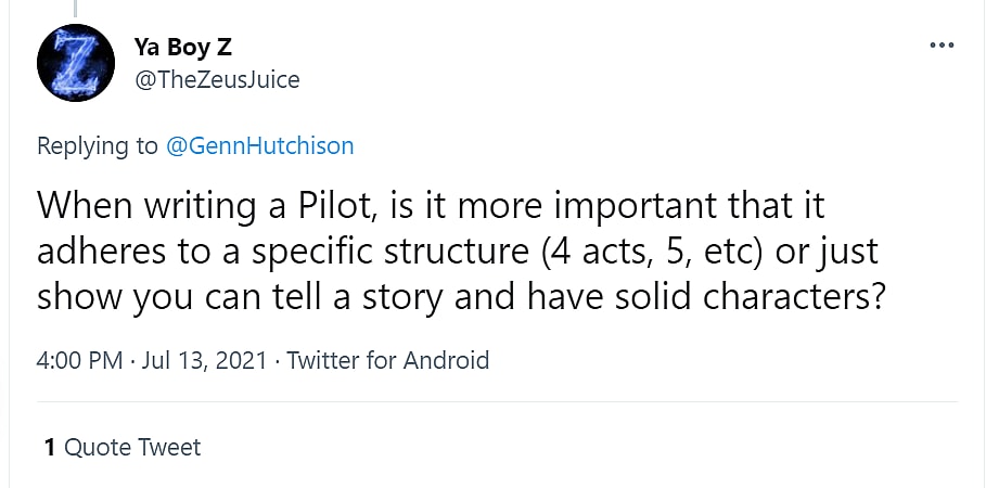 Twitter user TheZeusJuice asked, “When writing a Pilot, is it more important that is adheres to a specific structure (4 acts, 5, etc) or just show you can tell a story and have solid characters?”