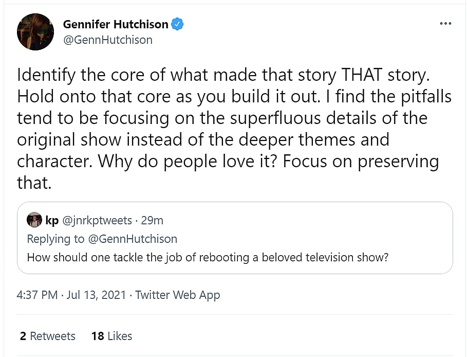 Next, jnrkptweets asked, “How should one tackle the job of rebooting a beloved television show?”