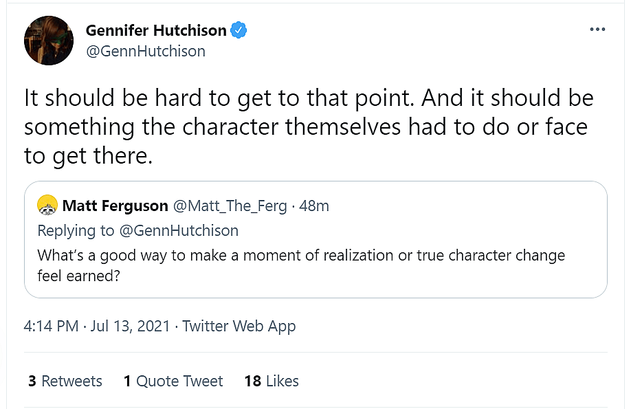 Matt Ferguson asked, “What’s a good way to make a moment of realization or true character change feel earned?”