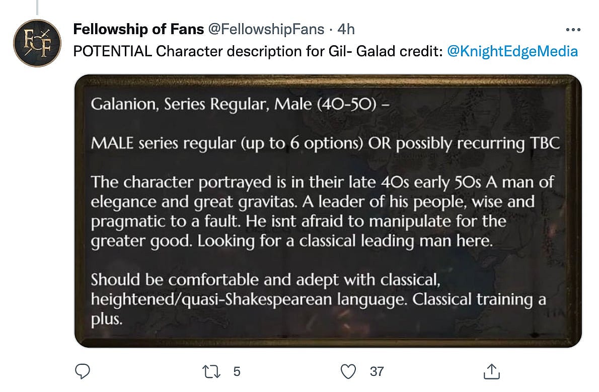 The rumor of Gil-galad’s inclusion in “The Rings of Power” was originally speculated about back in July 2020 by TheOneRing.net as part of their San Diego Comic-Con panel.